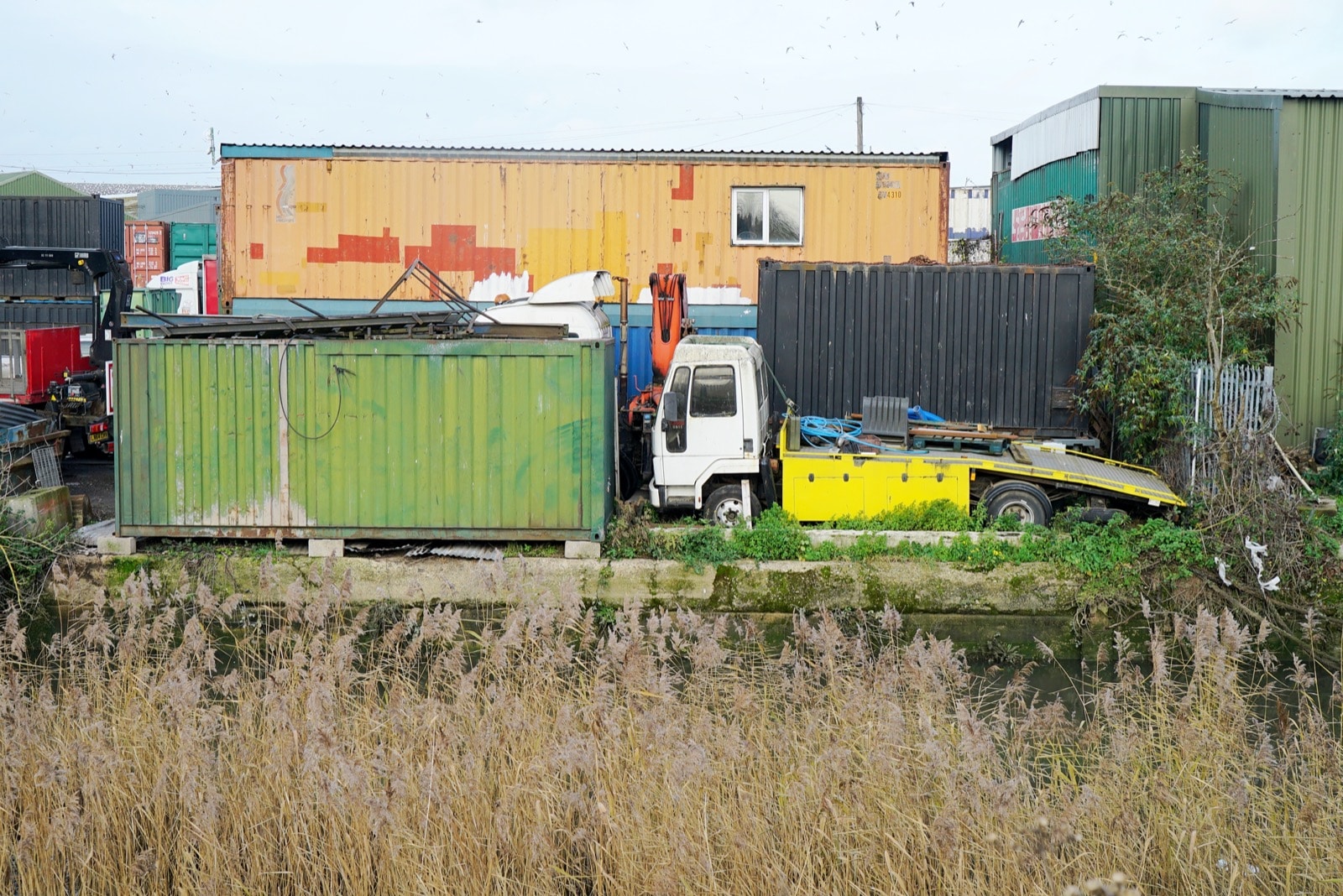Clouds of white birds (terns?) rose as one from the damp ground as I walked. They swirled in the wind and then settled again once they had sussed me out. I love birds but I can’t get interested in ducks, geese, and seagulls. I’m not sure why. I think my disinterest in seagulls comes, like pigeons, from associating them with too many of them swirling around to feed on human scraps. That made sense here for, after a couple of hundred metres of marshland I turned left up a different creek, and arrived at a council “waste reception centre and transfer station”: a tip in other words. I watched through a high security fence as men driving diggers shunted heaps of stinking bin bags around. Flocks of seagulls squabbled over nappies and pizza boxes. One gull was trapped in the narrow space between two fences, unable to take off vertically enough to escape. I watched it flap in panic but could not reach it to help. A heron then took flight from the bays of rotting rubbish, perhaps preferring its easy pickings to the creek on my side of the fence. Seeing that huge, prehistoric bird in the tip dismayed me. I watched it bend back its spindly knees, flap those 6-foot grey wings, and launch itself upwards to circle away over the marsh.