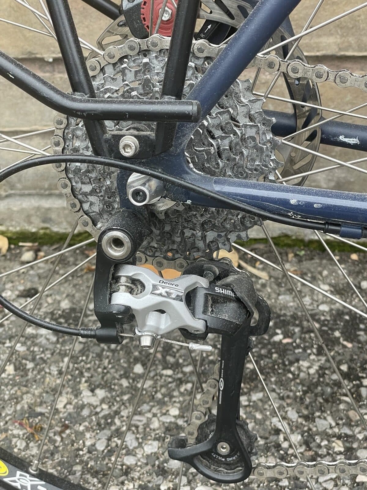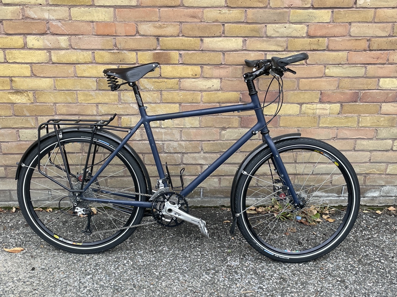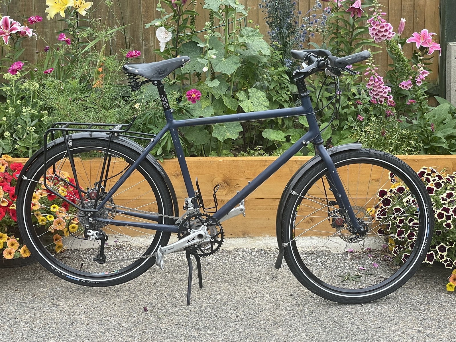 The bike is designed and built to be able to ride around the world, and to be able to be fixed anywhere in the world. It’s the bike of choice for legendary cycle tourers Josie Dew and Bettina Selby. It could do with a full service. The standover height is about 79cm. There is room for manoeuvre in the saddle height so I can’t see why a woman shouldn’t use it perfectly well. It was built in 2011. Chas Roberts himself made the frame. The bike won best touring bike category at the Bespoke Bike show in 2012. It is a bit heavy (16kg) but built with a Shimano XT group. The handlebars and stem can be changed to drops/butterfly or moustache if wanted.