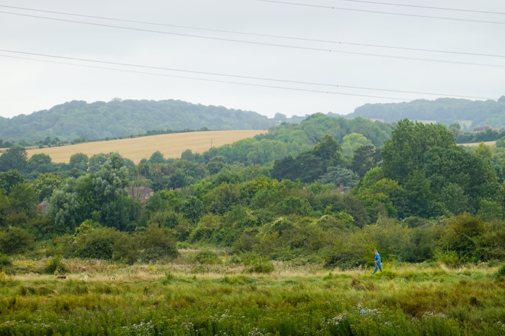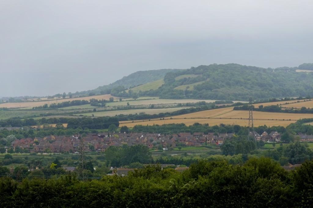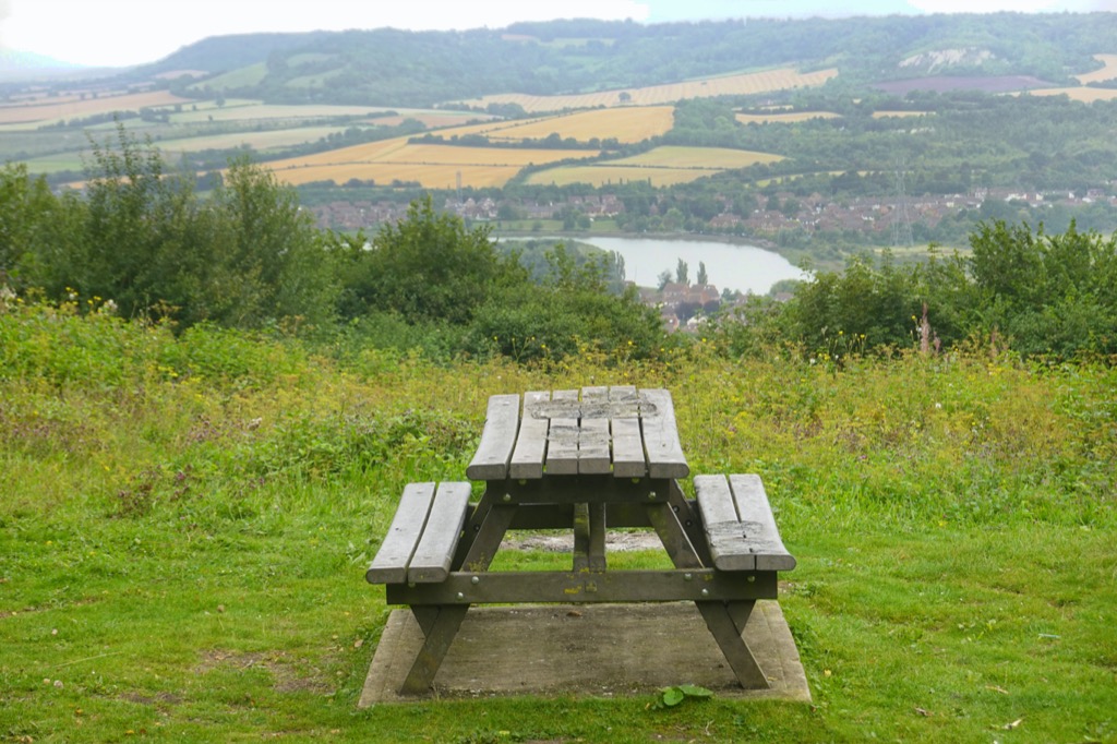At the top of the woods was a lookout point, provisioned with a picnic table and an excellent view over the village (and the inevitable new development just to its south), over the river and towards the chalk ridgeline of fields and woods that I have often enjoyed visiting on my forays across this map. The picnic table bore the scorch marks from at least half a dozen disposable barbecues.