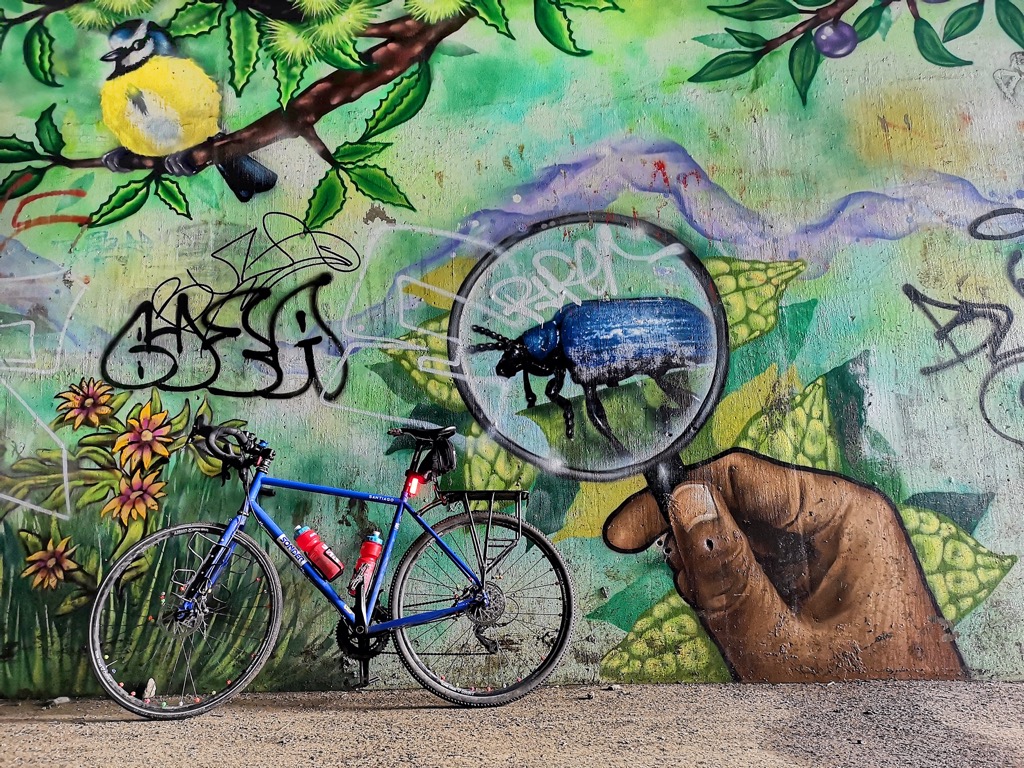 Amongst the many, many benefits of bikes over cars is enjoying the sense of smell out on the road. I would be fascinated to learn how a blind person might experience all these squares I have documented. Today’s ride, for example, took me down a high street of frying chicken, past teenagers on a park bench and the high reek of weed. The smell of damp puddles and piss in a gloomy subway beneath a motorway, where nonetheless I lingered for a while to photograph the spray can murals of a blue tit and beetle. A muddy footpath along the edge of a golf course brought a waft of golfers’ Lynx into the weirdly spermatic scent of a sweet chestnut wood. As the afternoon warmed I smelled the softening of tarmac roads, the charcoal barbecue at a Bowls club, a car’s faux-pine air freshener at a traffic light, the heady purple scent of lavender fields, the fumes of exhausts and, increasingly, my own sweaty stink.