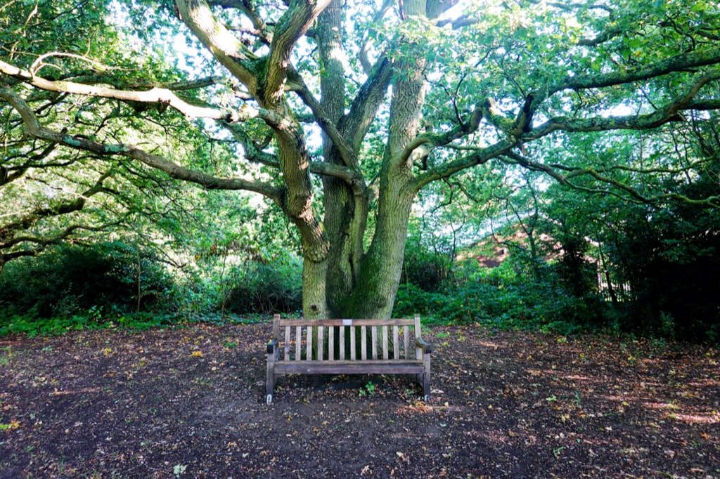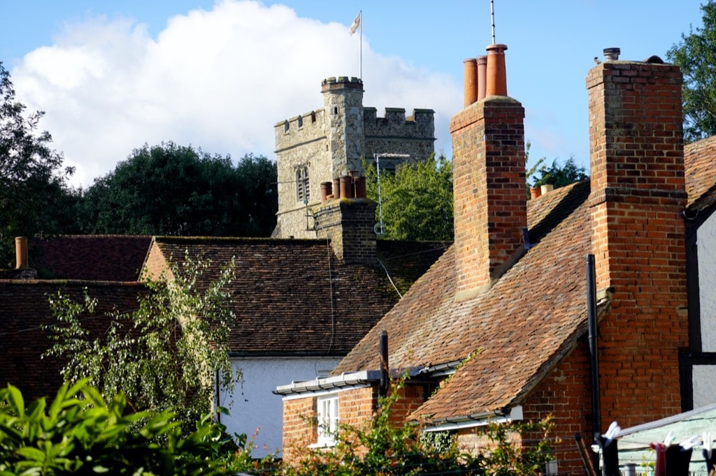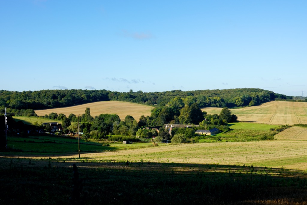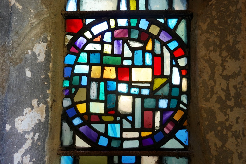 The path ran alongside a tiny trickle of a stream, its gentle tinkling sound a rarity on this porous, chalky landscape. I was heading in the direction of the square church tower and the steep red roofs and brick chimney stacks of an old village. The path behind the church bore a sign saying, ‘Prohibited, all vehicles except handcarts, perambulators, invalid carriages and pedal cycles pushed by hand.’ I poked my head briefly into the church. A quiet prayer service was taking place in a side chapel. I think it is the first time I have encountered anyone in all the churches I’ve visited on my map. I paused to appreciate the stained glass windows given ‘in thankfulness for the beauty of the ever changing seasons’.