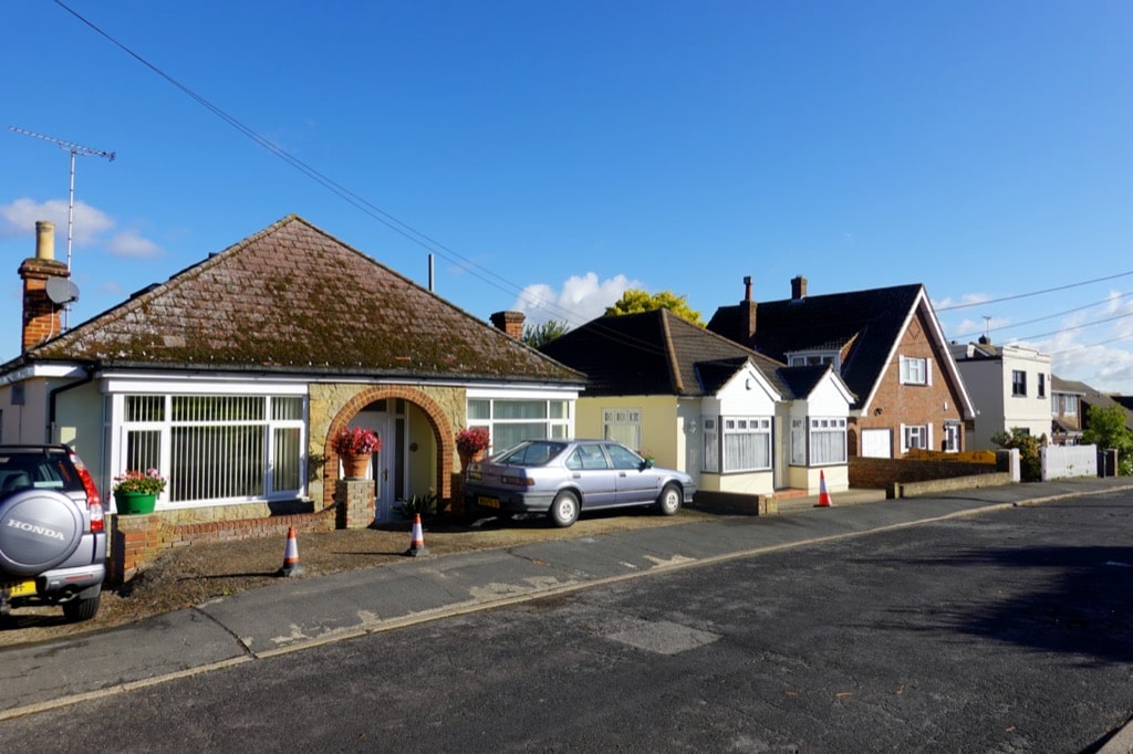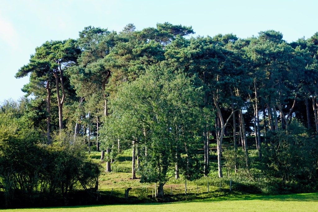 I cross the busy main road that leads into town, walk down a bumpy and potholed farm track with grass growing up the middle, and past an old caravan slowly being engulfed by brambles and elder bushes. A footpath led me round the back of a row of garden sheds and into a silent development of bungalows and small postwar homes. The parallel residential streets backed up against more farmland. A farmer raised a hand in greeting as I walked a footpath across a field, towards an incongruous cluster of Scots Pine trees and the clanging assembly of a large white wedding marquee.