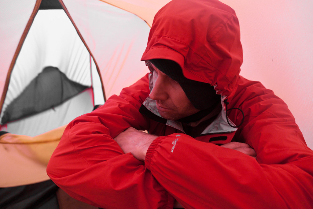 And the rain fell, and the winds blew and slammed against the tent. Days of rain turned into weeks. The world was monochrome. Icy rain and flurries of snow challenged our lightweight clothing. We wore every stitch of clothing we owned and still we were cold. The only colour came when we escaped from the world, into our little red tent at day’s end.