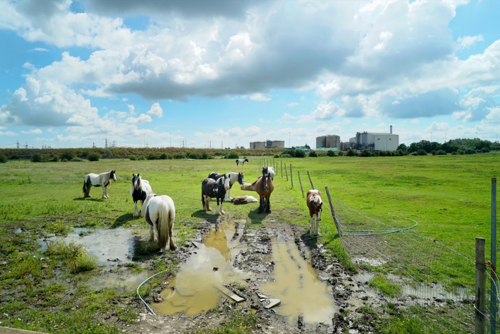 Flocks of starlings tolerated the roar and hot air blasts from passing lorries, but were startled by me on my little green bike. They flew away over a scrap of waste ground where a forlorn looking pony was tethered, munching its way through the grass it could reach between the main road and the railway line.