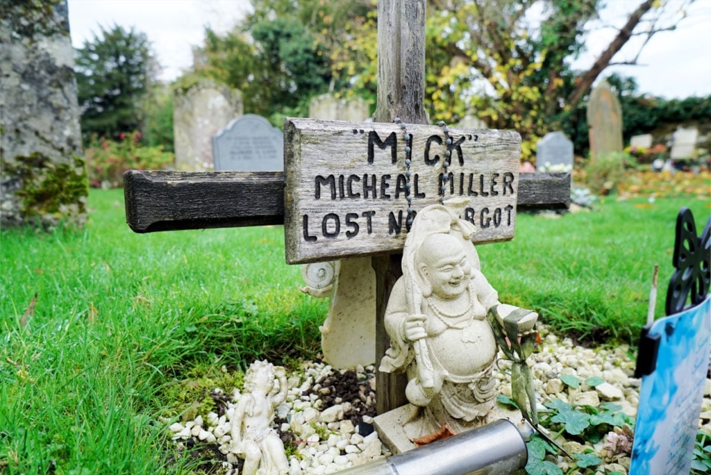 I love gravestones. They stir my imagination. I like to calculate the ages of people, feel sad about those who died young, pause at those who die around my age, and wonder about all those husbands and wives ‘reunited at last’. I walk past simple wooden crosses. There’s one for ‘”Mick”, Micheal [sic] Miller, Lost Not Forgot” with a statue of a fat, smiling, wandering Budai. Another is “In Loving Memory of Hazel, Mum and Nan, Bill, Dad and Pops” with a simple drawing of a football and a flower. There are well-tended plots with little white railings, heaps of flowers, little statues of rabbits and deer, and photos of Mum and Nan. And there is Bill and his “old sweetheart” Jean.