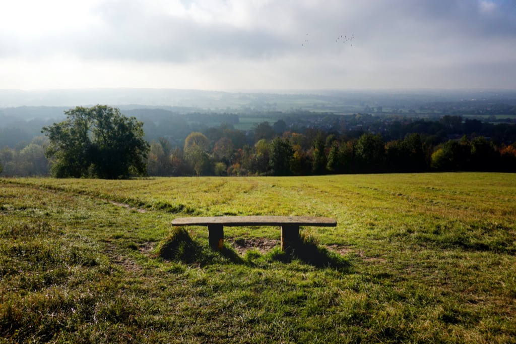 The floor of the wood was covered in a golden carpet of leaves and thousands of beech nuts lay beneath each tree. One giant of a tree had heavy straps tied between its two primary branches to help prevent the top-heavy tree splitting asunder in heavy winds. I crunched my way up through the woods to the open hilltop which offered wonderful views across the still-misty landscape, though up here the sun was bright. I passed a large cross and two horses – one grumpy, one friendly. The friendly horse was adamant that I should give him a good long stroke before continuing. A bench on top of the hill had something I have never seen before; a solar-powered speaker which gave you information about the local area when you pressed the button. A bunch of lost keys hung on the fence, a beam of sunshine shone all the way through the gnarled trunk of a hollow ash tree, and a white passenger jet flew high overhead in the flawless blue sky. I used to fly often, and far, and I enjoyed it very much. But I have not been on a plane now for a couple of years or more. I miss the excitement and the variety and the surprise of fast foreign travel. But I miss it less than I thought that I would. I miss it less the more time goes by. And I certainly miss it less when I pour myself into the astonishing richness of exploring a single map.