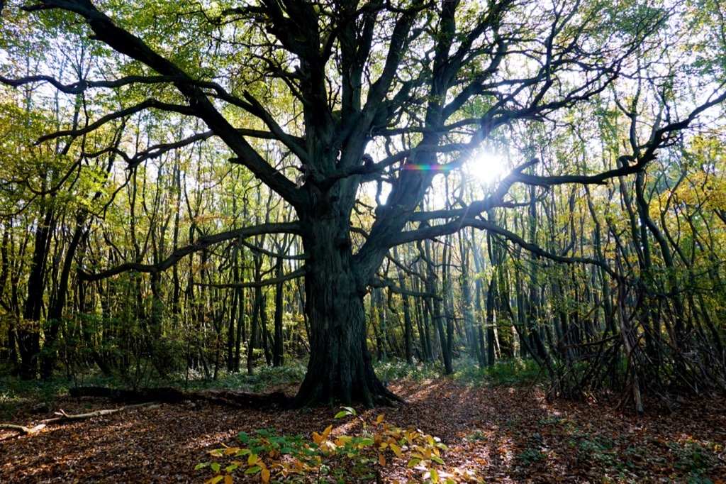 During spring and summer, chlorophyll helps plants with the process of photosynthesis. This turns carbon dioxide, water and the light from the sun into sugars that feed a tree. The green from chlorophyll masks other colours throughout the sunnier months. Then, as nights start to grow longer and less sunlight is available, this signals to trees that autumn is on the way. The production of chlorophyll slows and then stops completely. This is when the golden hues we love start to appear.