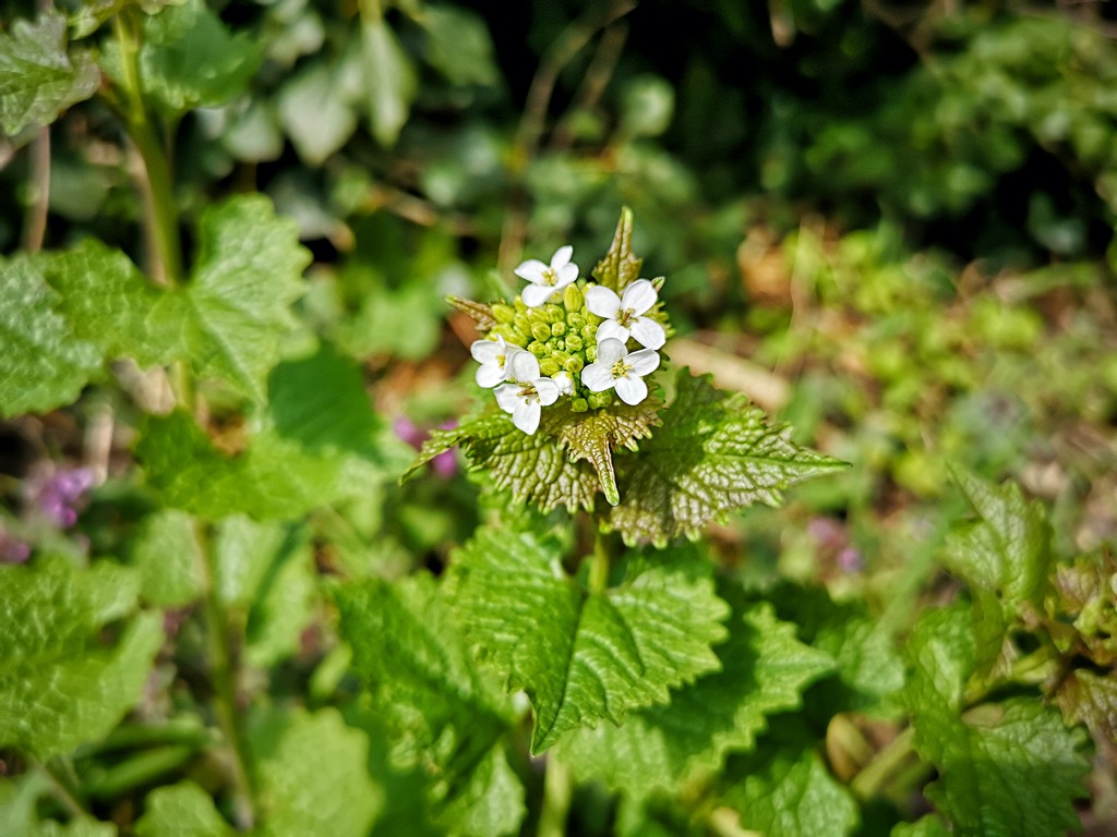 The roadside verges grow thicker and more green every week that I’m out exploring. I stopped today to nibble a few leaves of garlic mustard, also known as Jack-by-the-hedge. The leaves of Garlic mustard are regularly used in salads, or as a flavouring for fish or meat. Young, fresh leaves can be picked in September when they first appear, and may be harvested until the flowers bloom the following spring. Garlic mustard has been used as an antiseptic herb for treating leg ulcers, bruises and sores, coughs and colds, clearing a stuffy head, to encourage sweating and even as a cure for colic and kidney stones. In Somerset, the fresh green leaves were rubbed on feet to relieve cramp.