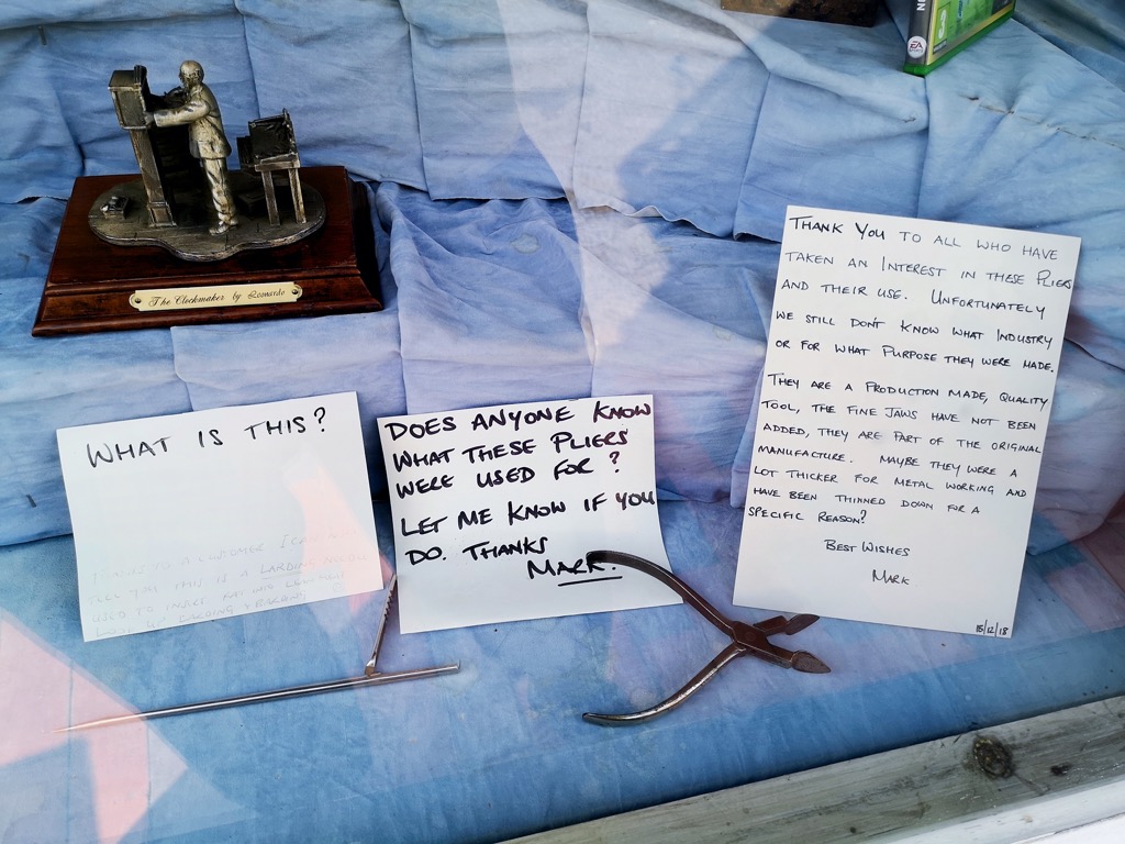 Updates to the mystery had been added: a note from December 2018 informed us, ‘Thank you to all who have taken an interest in these pliers and their use. Unfortunately we still don’t know what industry or for what purpose they were made. They are a production made, quality tool, the fine jaws have not been added, they are part of the original manufacture. Maybe they were a lot thicker for metal working and have been thinned down for a specific reason? Best wishes, Mark.’