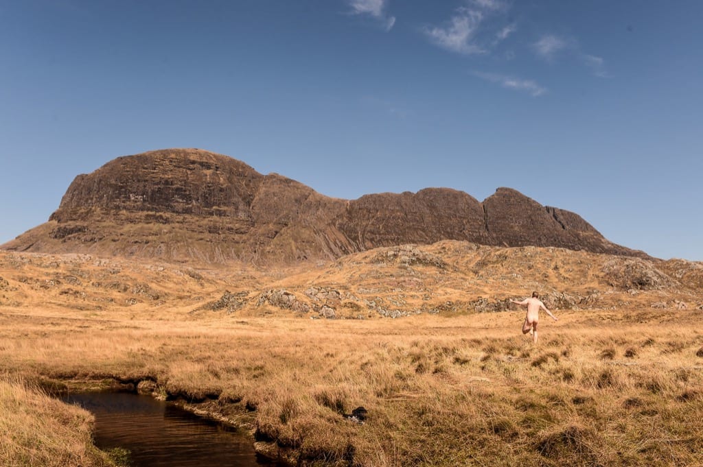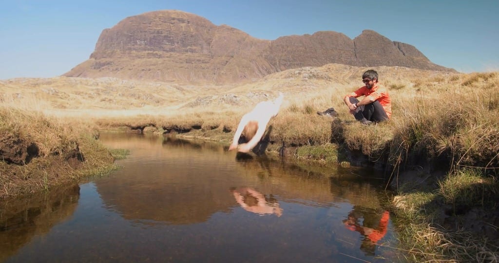 That same warm sunshine soon prompted me to brave the waters of the loch we filled our bottles from. I sprinted down the sandy beach to force me into courage then plunged howling into the cold water. Then in the afternoon I swam again, in a stream at the base of the mountain. I wanted one more refreshing plunge before the hot climb began. The water was about a metre deep, beautifully still and clear with a whisky tinge of peat. Suilven looked beautiful in its reflection.