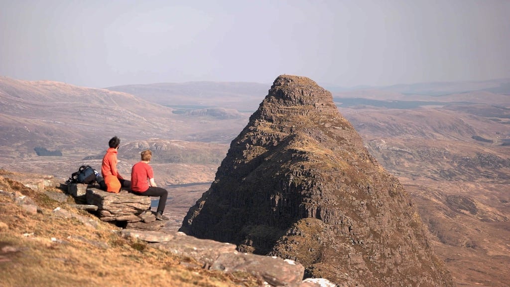 The ascent of Suilven was steep, rocky and sweaty, but crammed into a mercifully brief struggle. Cresting the ridge of the mountain we were blasted by strong winds but also gifted a huge new view, northwards across miles and miles of emptiness towards Quinag and the blue hills beyond it. We followed the narrow ridge in single file up towards the summit, so close now, after so long anticipating it. Tem and I were eager to drop our packs and revel in being up here at last. The flanks of Suilven are so sheer that the view is like looking down from an aeroplane, yet with the bonus of it being a view that we had earned. Beneath a bald blue sky we gazed upon miles of shining lochs, folded ridges of silhouetted mountains, and out over the sea towards the setting sun.