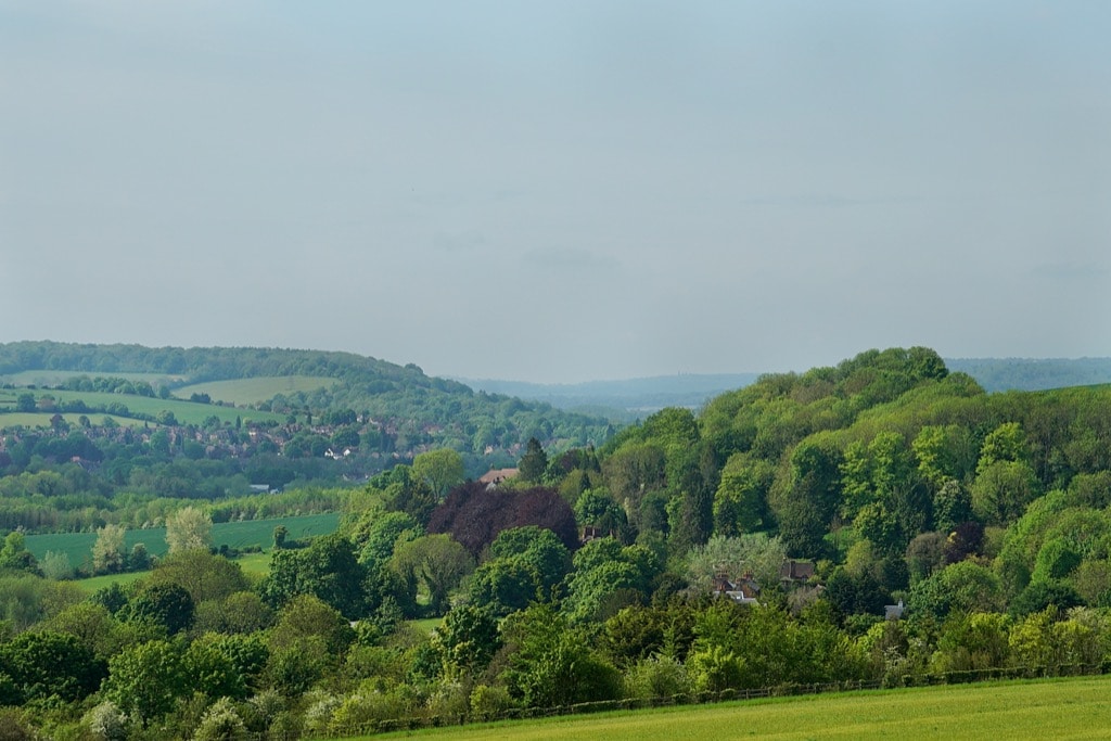 I enjoyed climbing up the hill. I stuck to my old rule of not looking around until I reached the top, to get the full enjoyment of seeing the view for the first time. It was a beautiful day, the first that has felt like summer, and the sky was hazy over a beautiful green landscape of trees, fields, villages and motorways. I could see the river valley curving away into the distance, towards the stream’s source and off the edge of my map.