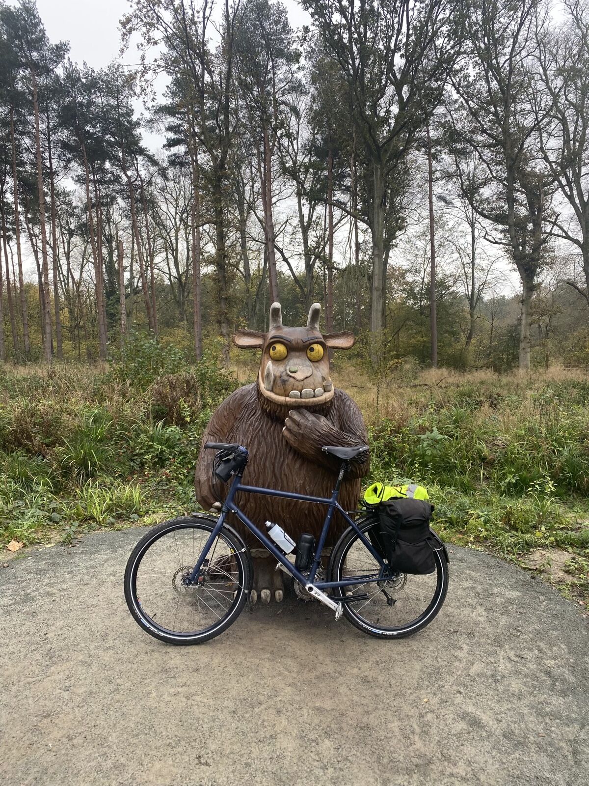 My next stop was Salcey Forest, where I had lunch at the cafe and my conscience decided that on balance a tray bake counted as a cake, so that was off the menu. I took the bike for a walk on the wellness path, which was a timely reminder to slow down and take in the autumn colours and notice there was indeed some sunlight piercing through the canopy. The bike had a selfie with the Gruffalo.
