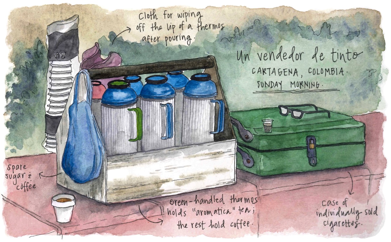 Alastair: Absolutely. From your paintings, my favourite stuff that you do are the little details of working life. There’s one you did recently about the coffee sellers in Colombia and you’ve done a really nice little painting. I like your little annotations of what each little tool does. I think you should definitely do more of those.