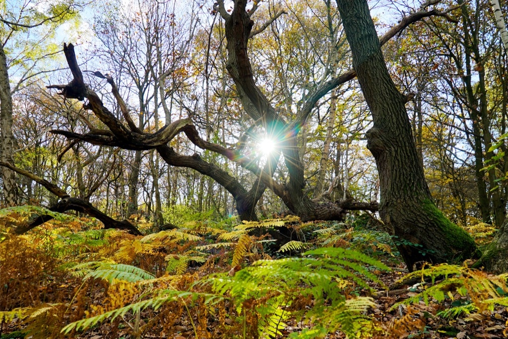 I put away my notebook and spend a happy half hour trying to take a photograph of a gnarled oak tree in a patch of bracken. I hope that this oak might be home to two nationally rare beetles (the shimmering two-spotted oak buprestid, since you ask). They are fond of dead oak timber and account for this wood being a Site of Special Scientific Interest. I’m trying to get the lens flare right, that dazzling effect of light rays you can conjure if you use a wide angle lens and a small aperture. My friend Martin taught me how to do it in Greenland, so I text him to say thanks. He replies to say, “Don’t be shy of letting more detail disappear into the light and this time of year when the air is cold you should set the white balance to the ‘shade’ warming temperature. Remember light in the shadows is cooler than light in the sunshine .. but it makes everything look inviting!”