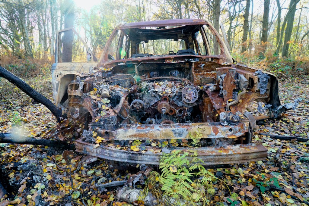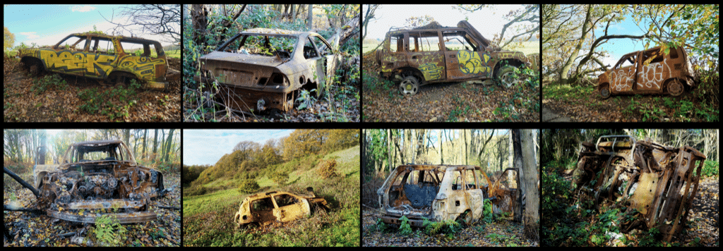 Most of the photographs I take in this grid square are not of quaint autumn trees, but are of burned-out cars or the detritus of hunting and clay-pigeon shooting. There seem to be more burned-out cars than birds in this wood! This is another thing I know nothing about: nicking cars, ragging around with your mates, bumping and bashing through a wood conveniently close to the main road out of London, drinking cider, and then setting it on fire to destroy all the evidence. Stupid, thoughtless, criminal, dangerous, messy. But I have to admit it also intrigues me and sounds exciting and fun! I settle for practising my lens flare photos and climbing onto one of the cars for a photo. That’s how I get my thrills these days…