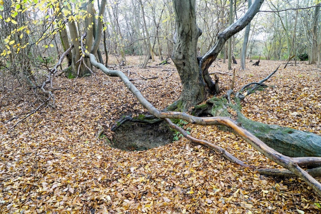 Originally this 800-year-old denehole would have been accessed by a 20 foot vertical shaft. This hole has been covered by a grate. But one of the denehole’s six domed chambers has collapsed, meaning that I could slither down through a hole in its roof. I am really claustrophic and squeezing through the narrow gap gave me more pause for concern than I had anticipated finding in this small suburban wood. Thankfully it quickly opened out into the high chambers that had been carved out for their chalk all those centuries ago. It was an astonishing feeling to stand in pitch darkness surrounded by such history. Rain pattered into the entrance tunnel, and I could still just hear the sound of traffic. But I felt very far from the world and was certainly glad that my friend was awaiting a text message to confirm that I got out OK.