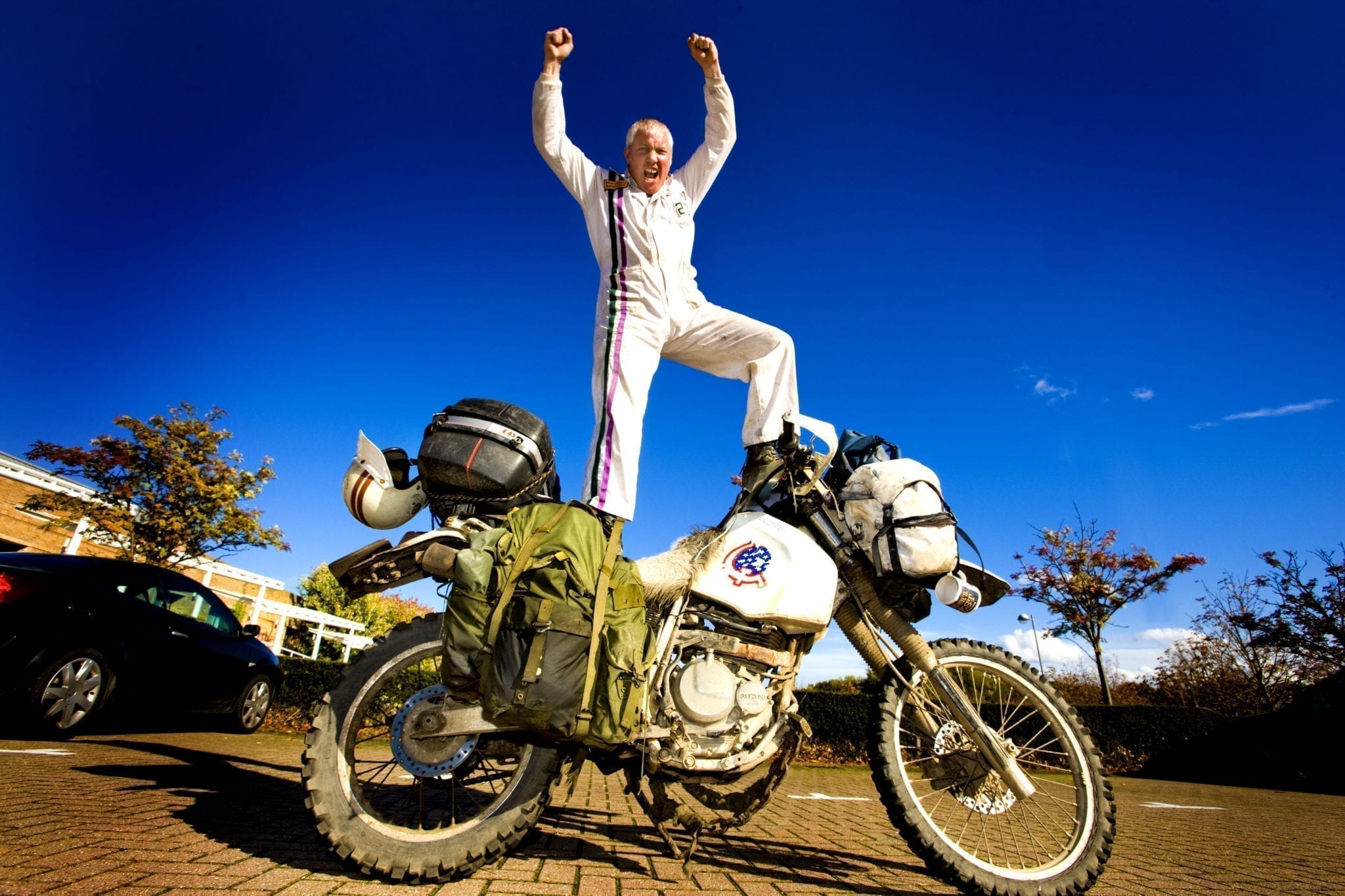 Round the World by motorbike (Austin Vince, in trademark funky coveralls)