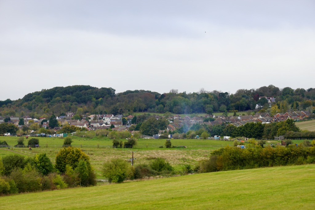 The footpath led to open fields, separated by hedges or fences and stocked with horses grazing quietly. The trees were still mostly green, though turning now to autumn colours. Autumn is much later than I always assumed. There were long views under grey skies across low, undulating land, sprinkled with modern housing developments, pylons and fields. It felt satisfying to look around and notice how places fitted together “OK, so there’s that big bridge… Oh yeah, there’s the huge pylon. I see where I am now.”