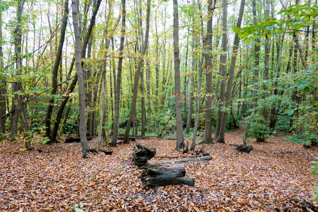 It was a nice wood, despite the motorway’s roar, a mixture of chestnut, oak and birch. I watched a jay fly past with a large chestnut in its beak, its electric blue feathers gleaming even in this dark wood. Years of old ropes, snapped or frayed and out of reach, hung from the limbs of a tall oak tree. The latest swing was a dark blue rope with a thick stick tied to the bottom to hang on to and I had a go, which turned into about ten. The swing was over a steep and muddy slope covered in leaves, a perfect spot for kids to slither up and career down, arms flailing, eyes wide, laughing with enjoyment. I spent a lot of my childhood messing about, unsupervised, in woods like these and I am very grateful for those memories.